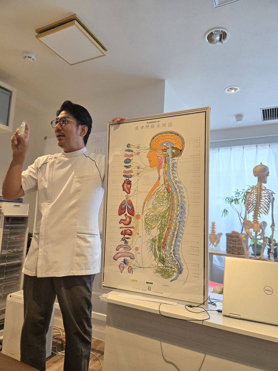 Au Japon, il est rare qu’un thérapeute détenteur d’un diplôme d’État enseigne directement à des praticiens exerçant avec un certificat privé, et les cours de Matsu-sensei, fondés sur une connaissance scientifique rigoureuse et une riche expérience clinique, sont hautement appréciés.